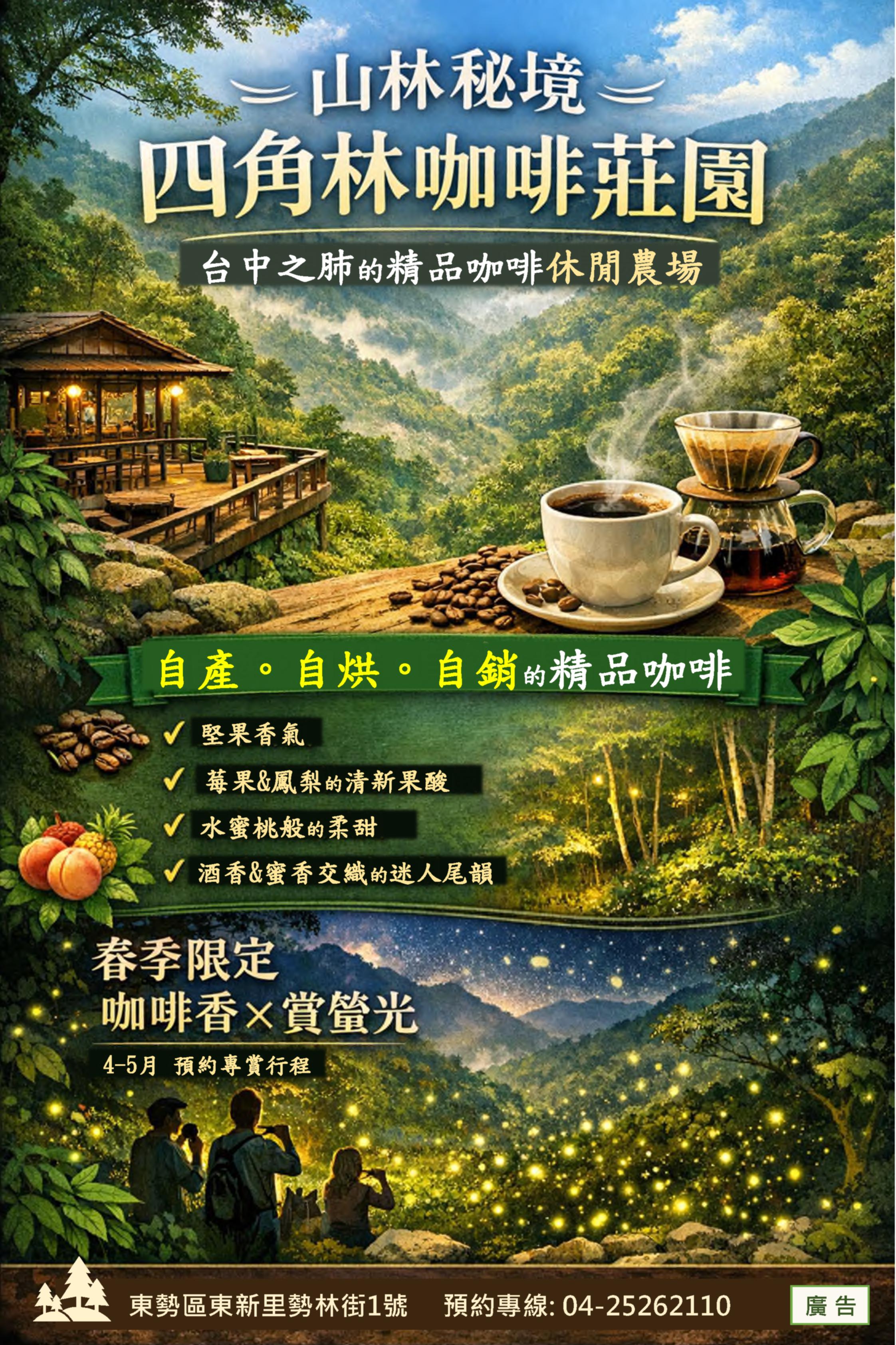 四角林咖啡莊園休閒農場,由臺中市農會經營,座落於臺中東勢區的山城腹地,前身即為知名的「四角林林場」,擁有175公頃壯闊山林,林相豐富、原始自然,遍布多樣樹種,成為孕育芬多精的寶地,被譽為「台中的綠肺」。